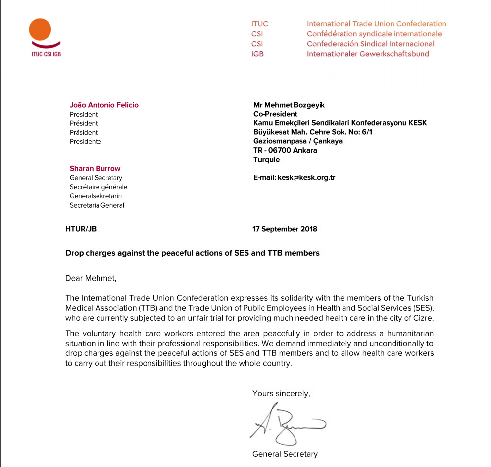 28 September 2018 Sharan Burrow: Drop Charges Against The Peaceful Actions of SES and TTB Members # Featured # Genel Share on Facebook f Share on X 𝕏 Share on Pinterest P Share on WhatsApp ☏